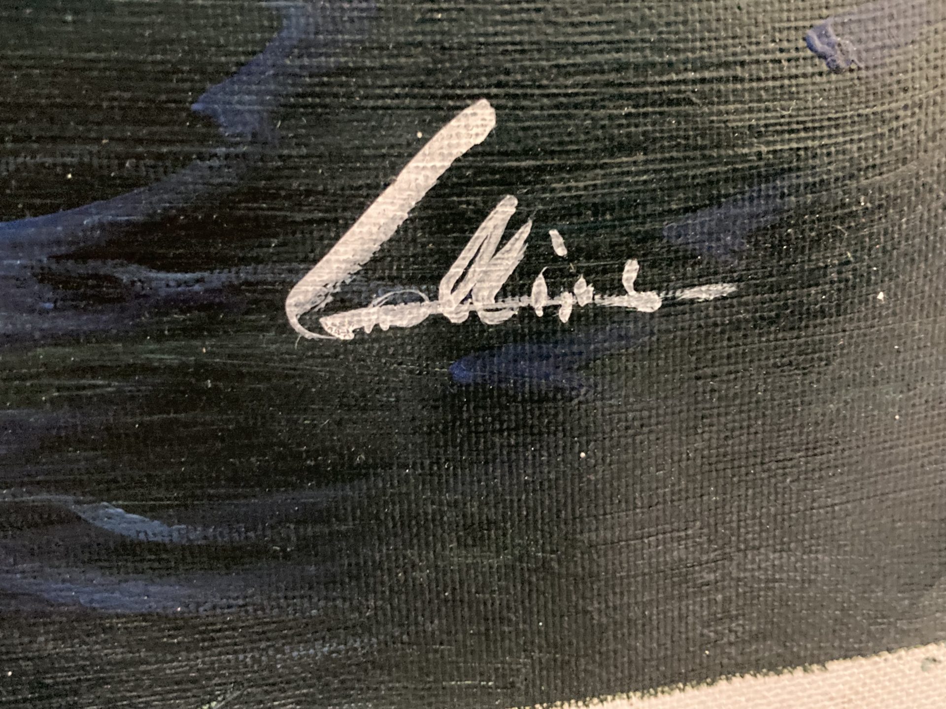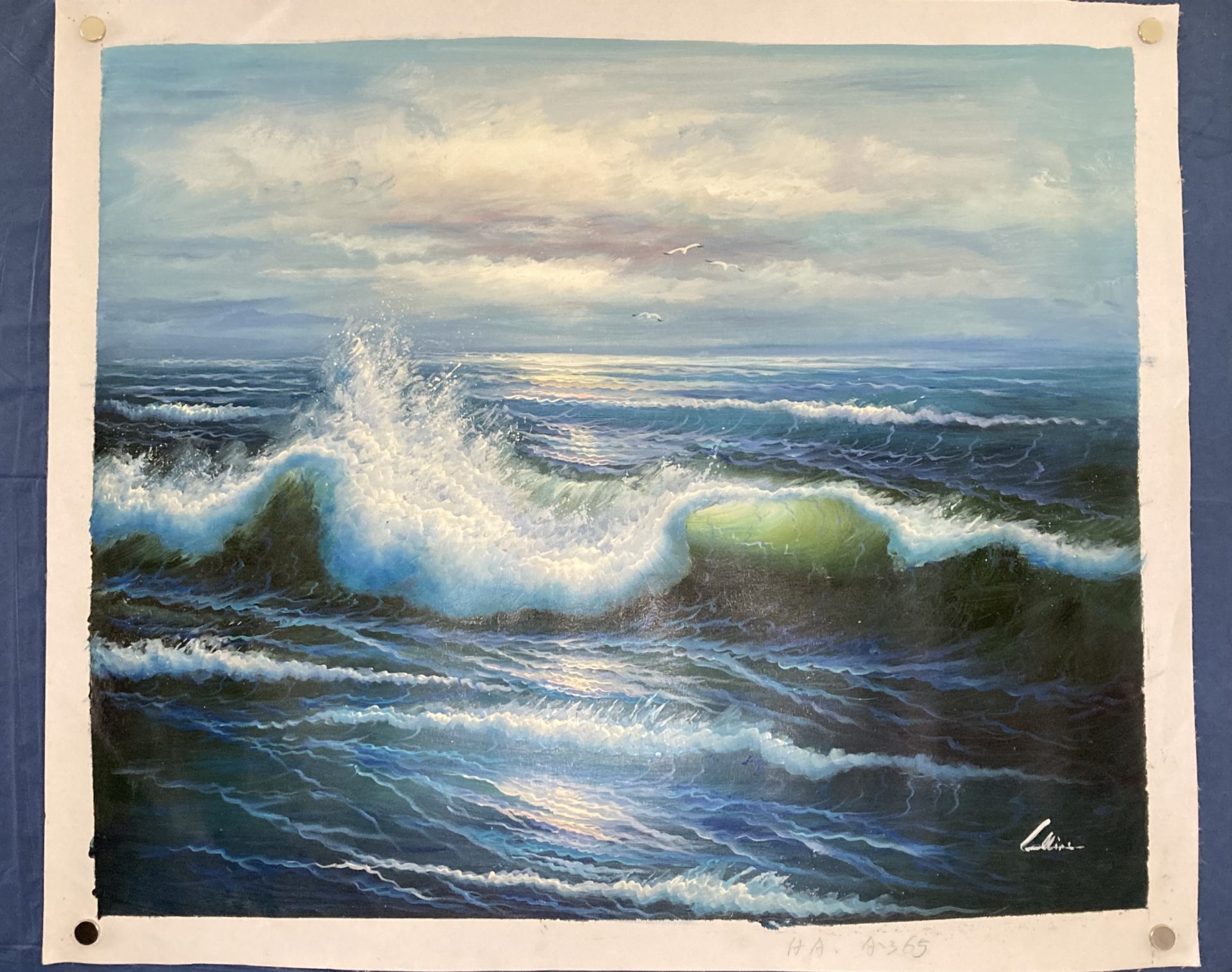 A mighty palette of blues and whites conspire to evoke this perfect moment of still life in motion. With the mighty waves churning and the surf spraying, there can be no doubt of the wet and turbulent scene this picture depicts. One can almost hear the crashing of the waves and the calling of the gulls as you gaze into masterful collision of blue and white hues here.