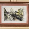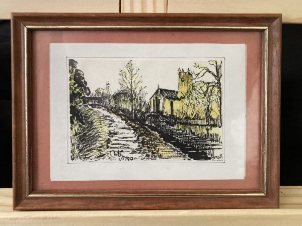 A rural scene depicting a railway track running adjacent to a lonely church. The use of shading in this piece creates a definitive sense of foreboding and isolation, particularly in how the railway track and church are separated by the interceding levee.