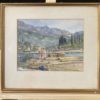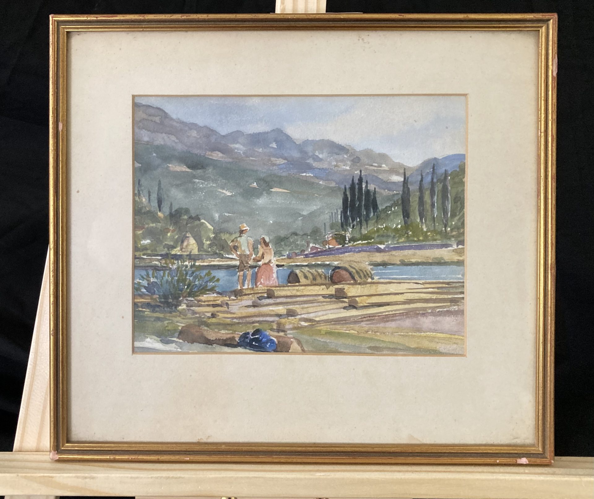 A cheerful watercolour moment featuring a pioneer couple celebrating breaking-ground on the construction of their new cottage.