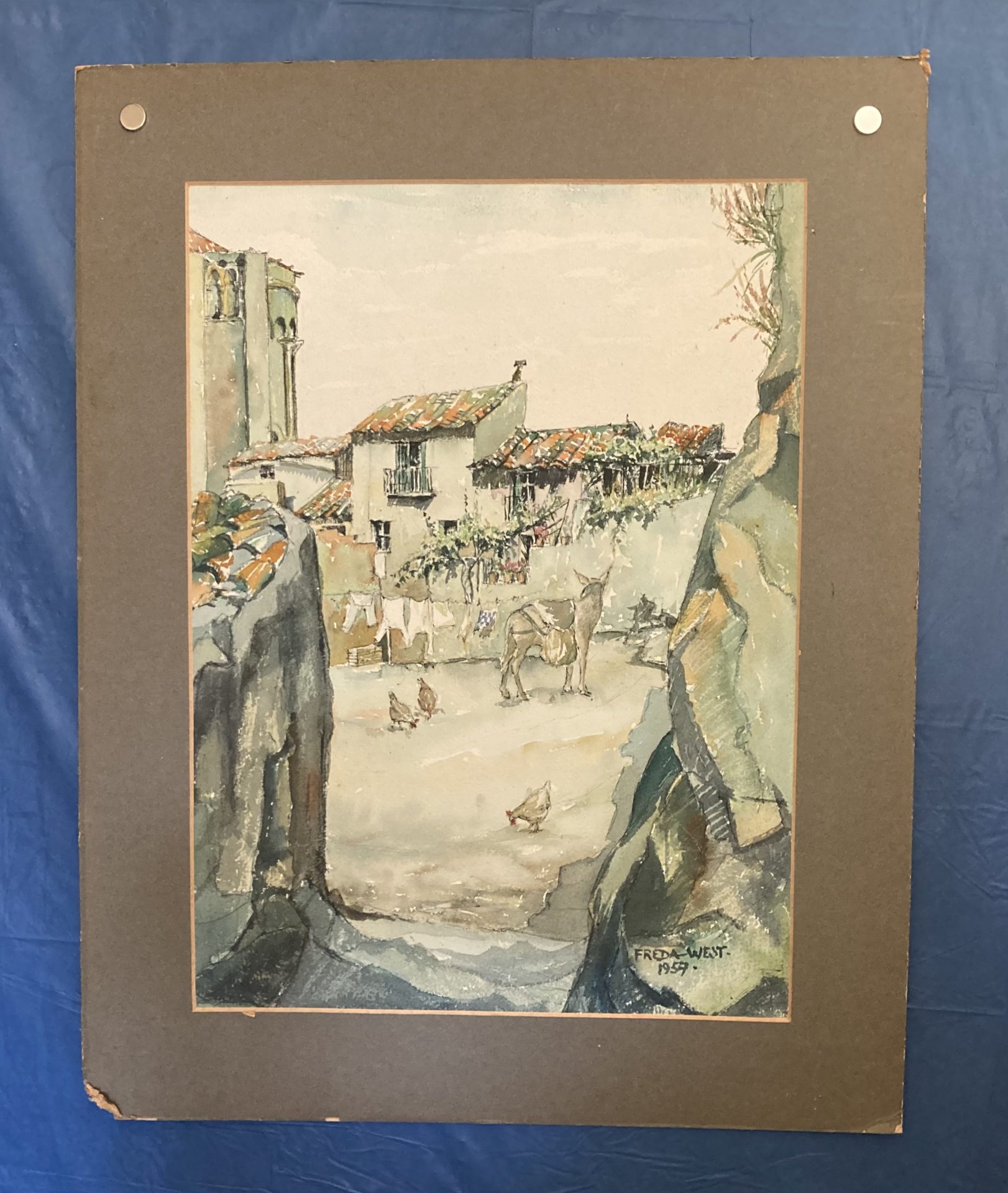 A charming watercolour scene depicting a donkey and some chickens within a residential area.