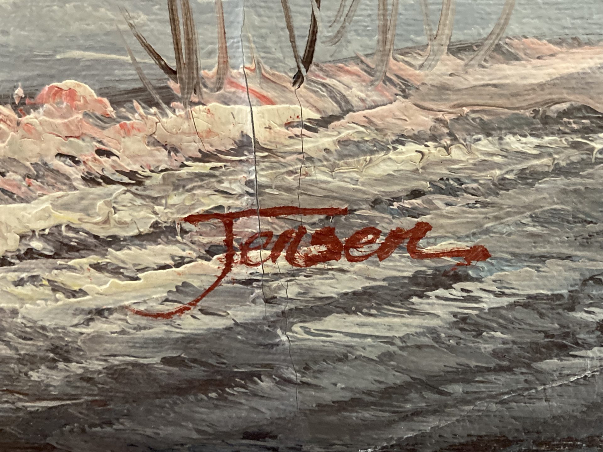 A beautifully photogenic scene capturing the view from a wintery rural lane. With the picket fences and timber-frame farm building capped in snow alongside the well-worn lane to the front and the blanketed field in the mid-ground, this elegant piece offers a detailed and idyllic viewpoint into the year’s colder months. Of particular note is the town in near-distance, depicted via hazy tones of greys and light blacks that melt seamlessly into the equally hazy pastel sky presiding above.