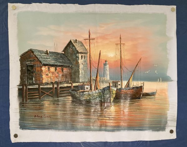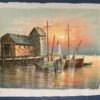 A delightful and thought-provoking scene of a harbour berthing a small selection of single-masted fishing boats, with quaysides and warehouses flanking alongside to the right. To the left are the calm harbour waters, the crystal blue dispelled only to reflect the watchful gaze of the hazy sun overhead. A blissfully calming piece, offering a glimpse of coastal beauty.