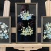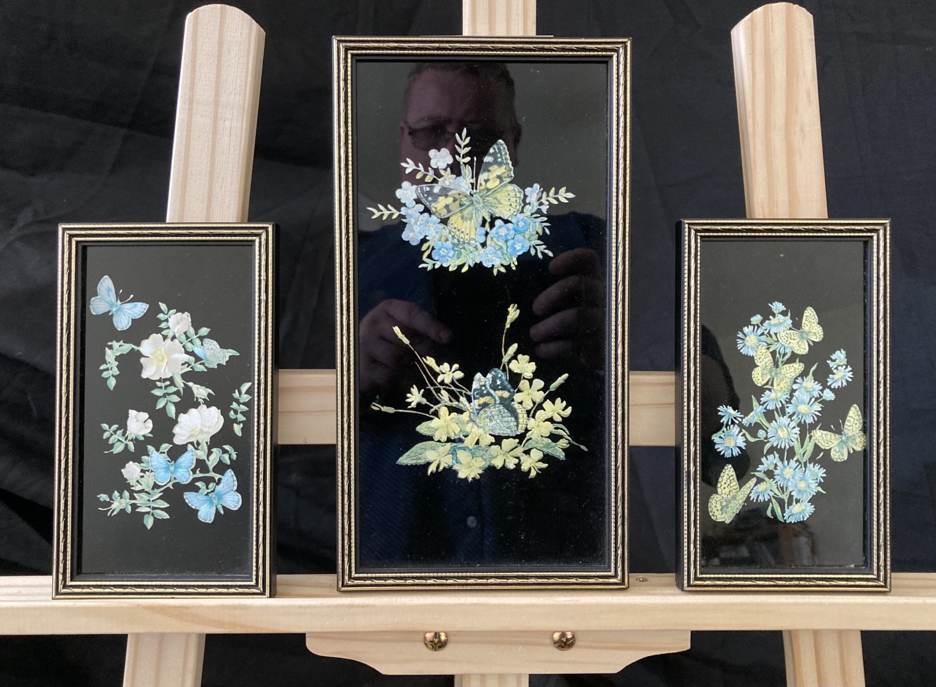 Series of three floral paintings featuring butterflies.