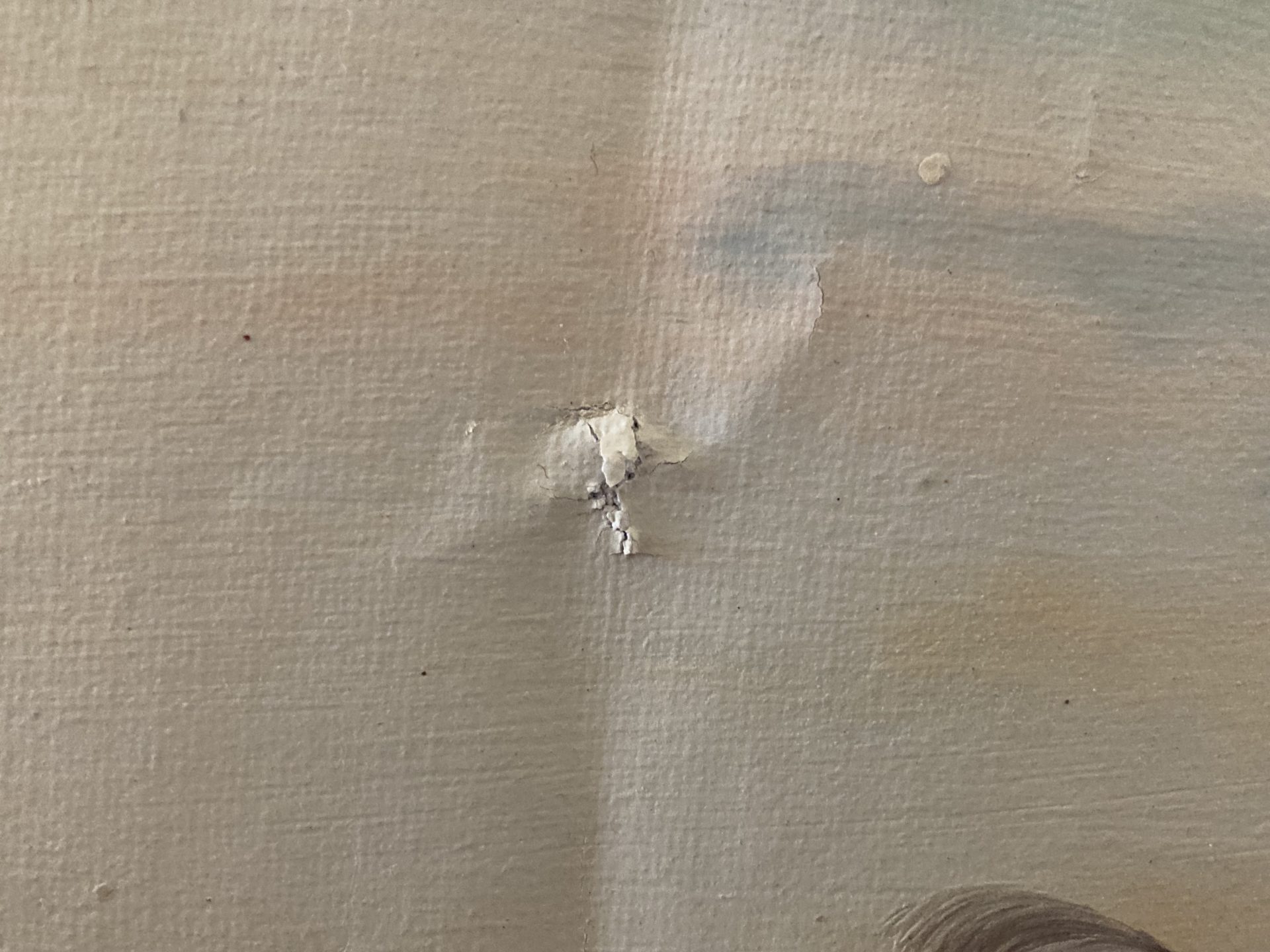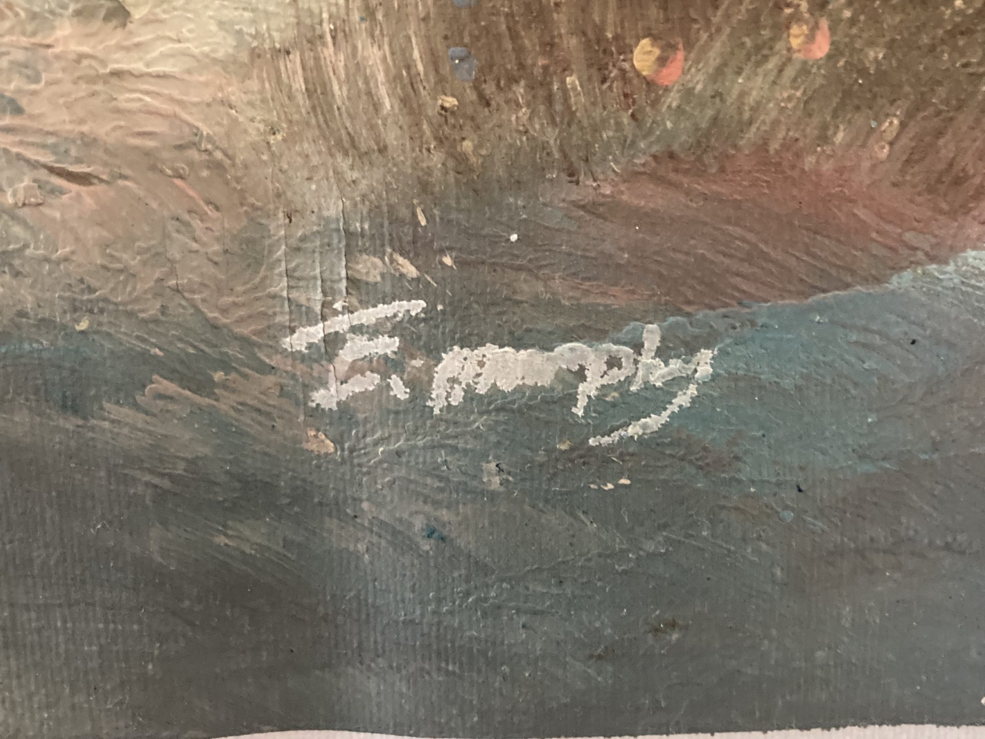 This playful, colourful piece offers a slice of storybook whimsy with its youthful protagonist emerging from the world beyond the reeds to one where the roaring tides meet the golden sands. As the young girl watches the cranes fly out towards the beautiful pastel horizon, one can almost picture the evening breeze rusting through those shoreline reeds, evoking a scene of contemplative wonder. Signed by “E MURPHY”, Slight rip to Canvas as pictured.