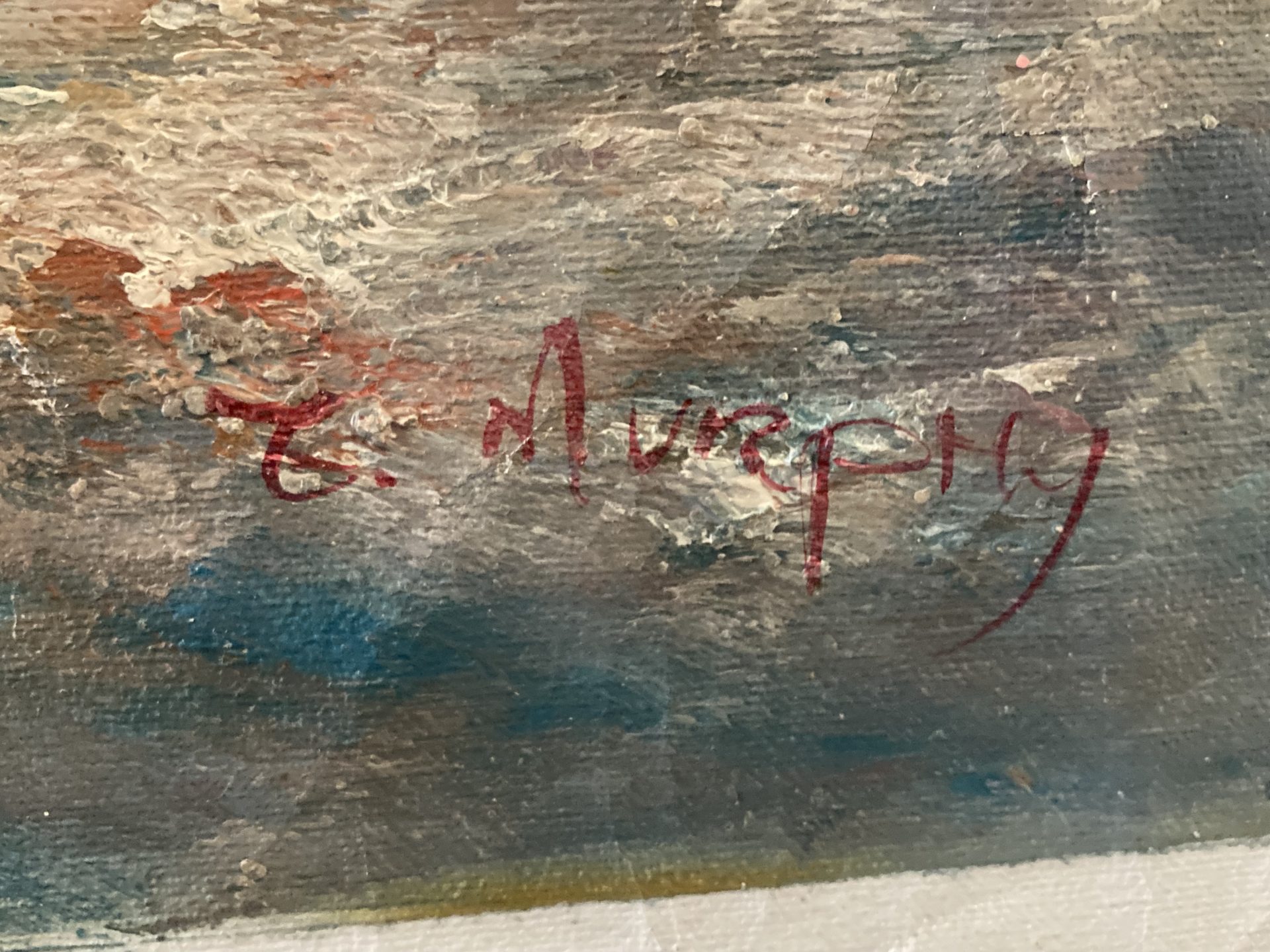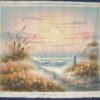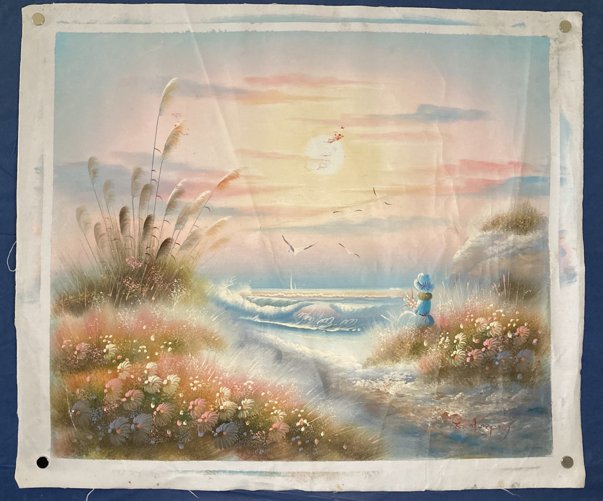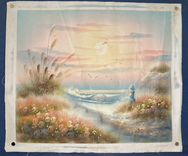 This playful, colourful piece offers a slice of storybook whimsy with its youthful protagonist emerging from the world beyond the reeds to one where the roaring tides meet the golden sands. As the young girl watches the cranes fly out towards the beautiful pastel horizon, one can almost picture the evening breeze rusting through those shoreline reeds, evoking a scene of contemplative wonder.