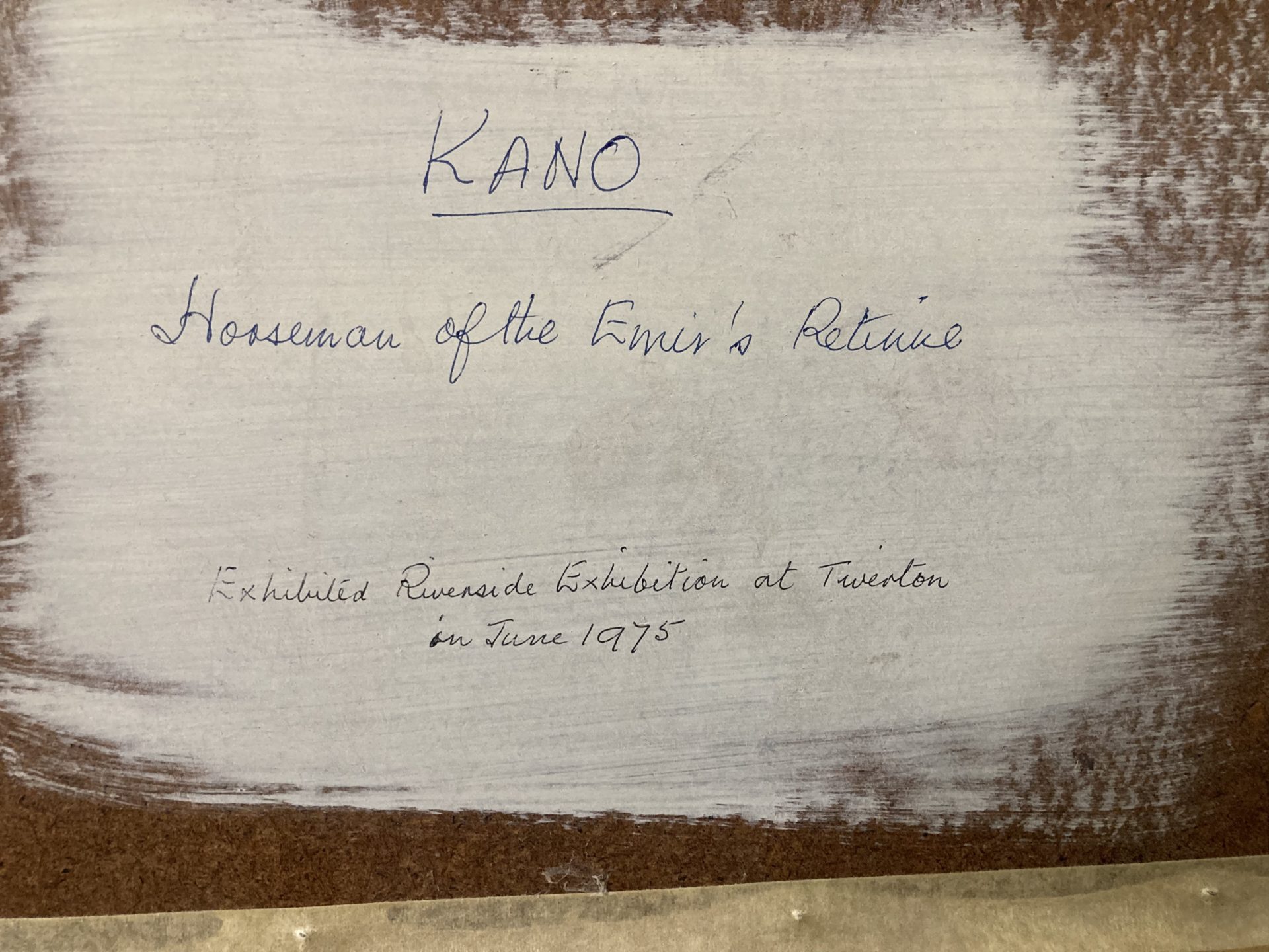 An exotic scene prominently showcasing a man in cultural attire atop a horse, presumably in a trading caravan or outpost in a desert locale, perhaps the Sahara.