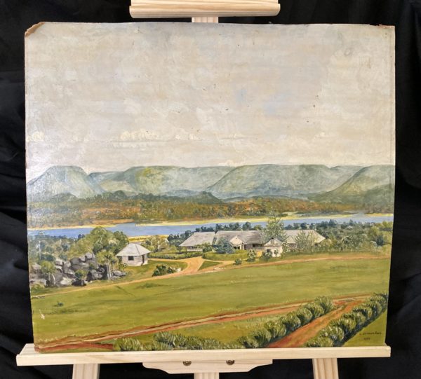 A wonderfully detailed rural scene depicting either a vineyard or a golf course set against some sweeping hills that invite curious minds into their emerald-drenched mystery. Fresh from the crystal waters of the winding river stretching across the scene lies the enigmatic but aesthetically-beautiful site with its complexes and manicured exteriors. Where will the wonder of this scene take you?
