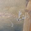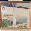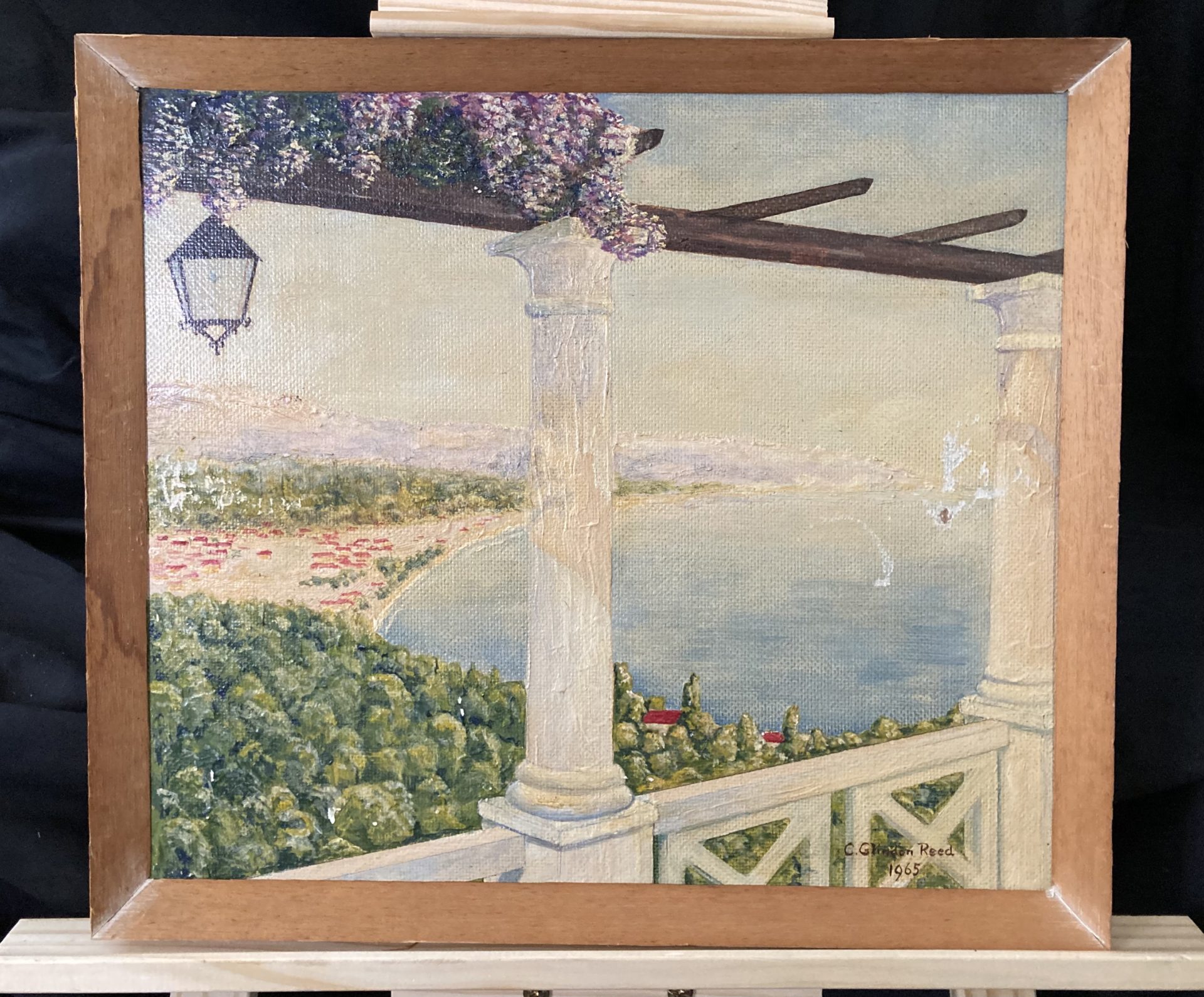 A charming Mediterranean scene depicting a picturesque vantage point overlooking a stunning bay. Of note are the Grecian columns and succulent detail and vibrancy of the nature on display here.