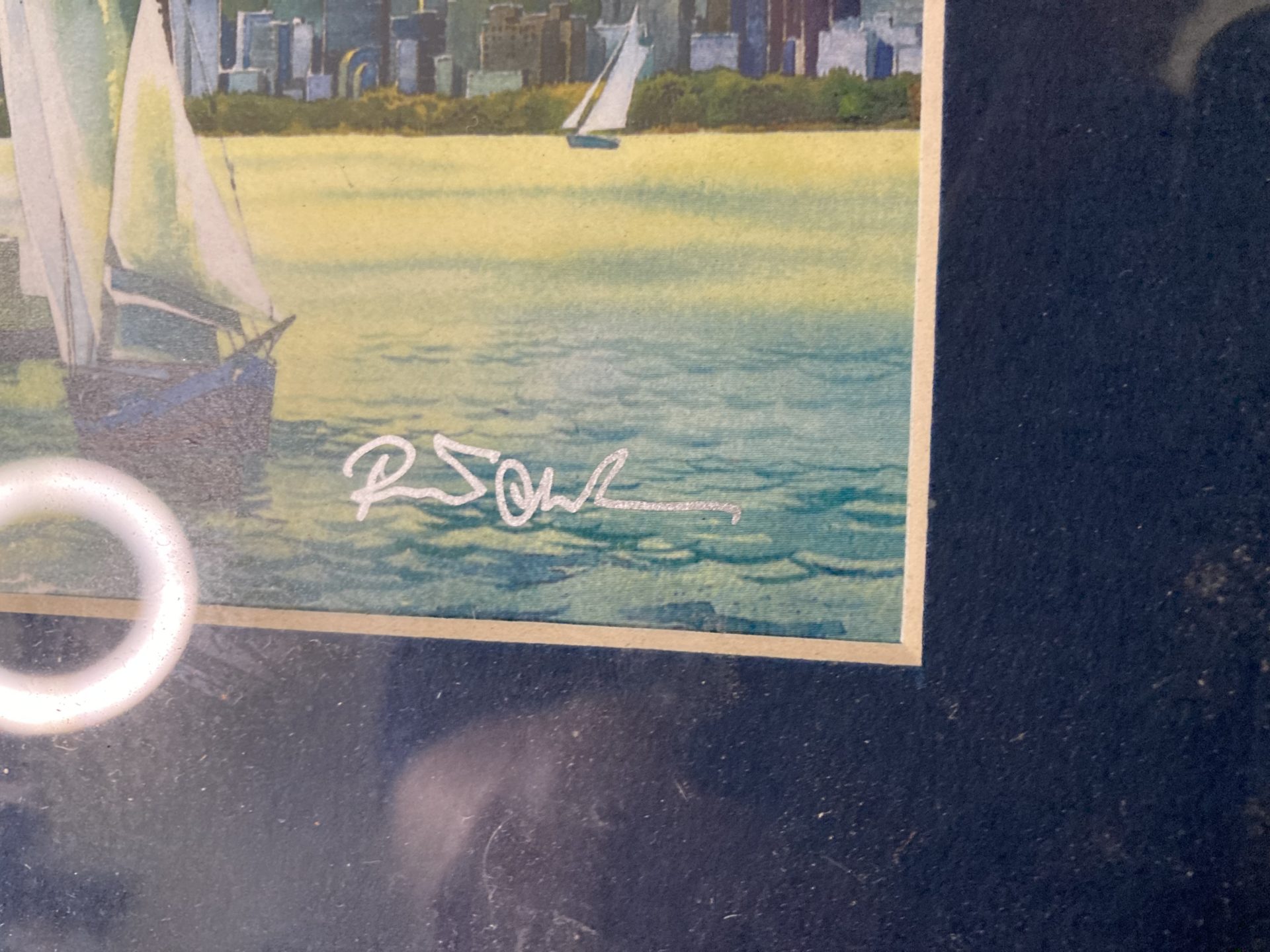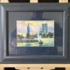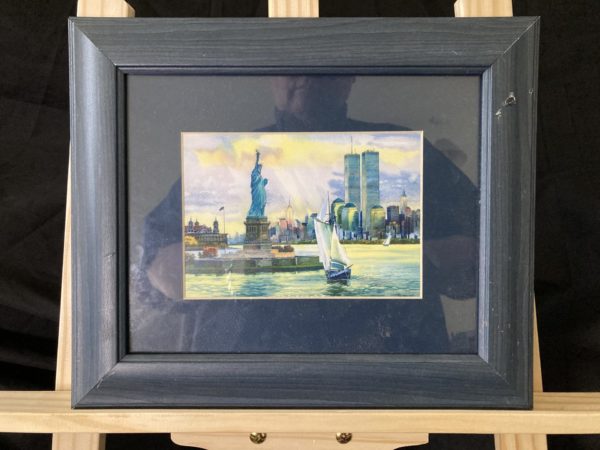 A beautifully colourful depiction of New York Harbour looking towards Manhattan and the Statue of Liberty. Circa late-twentieth century given the inclusion of the iconic Word Trade Centre towers.