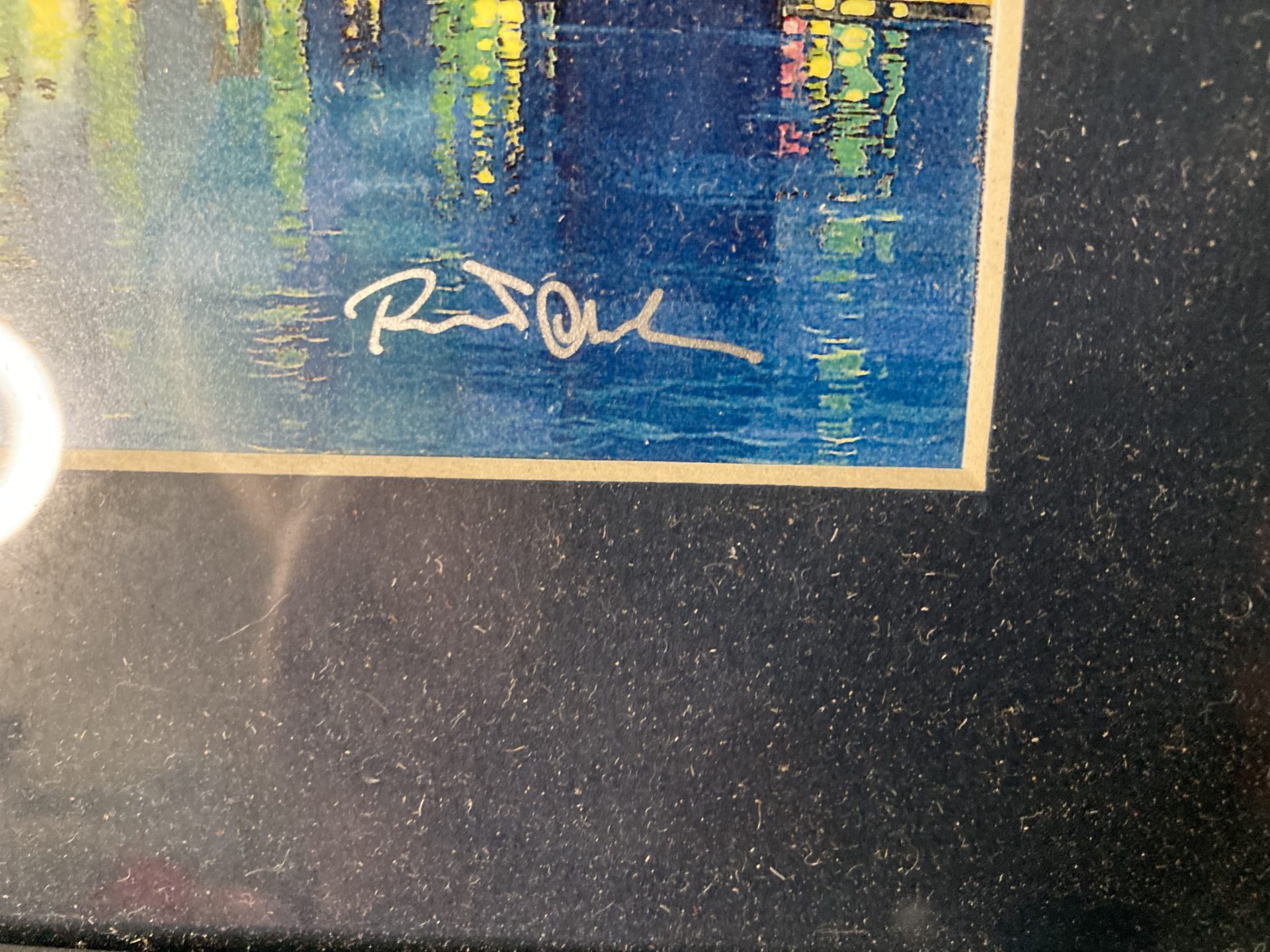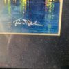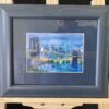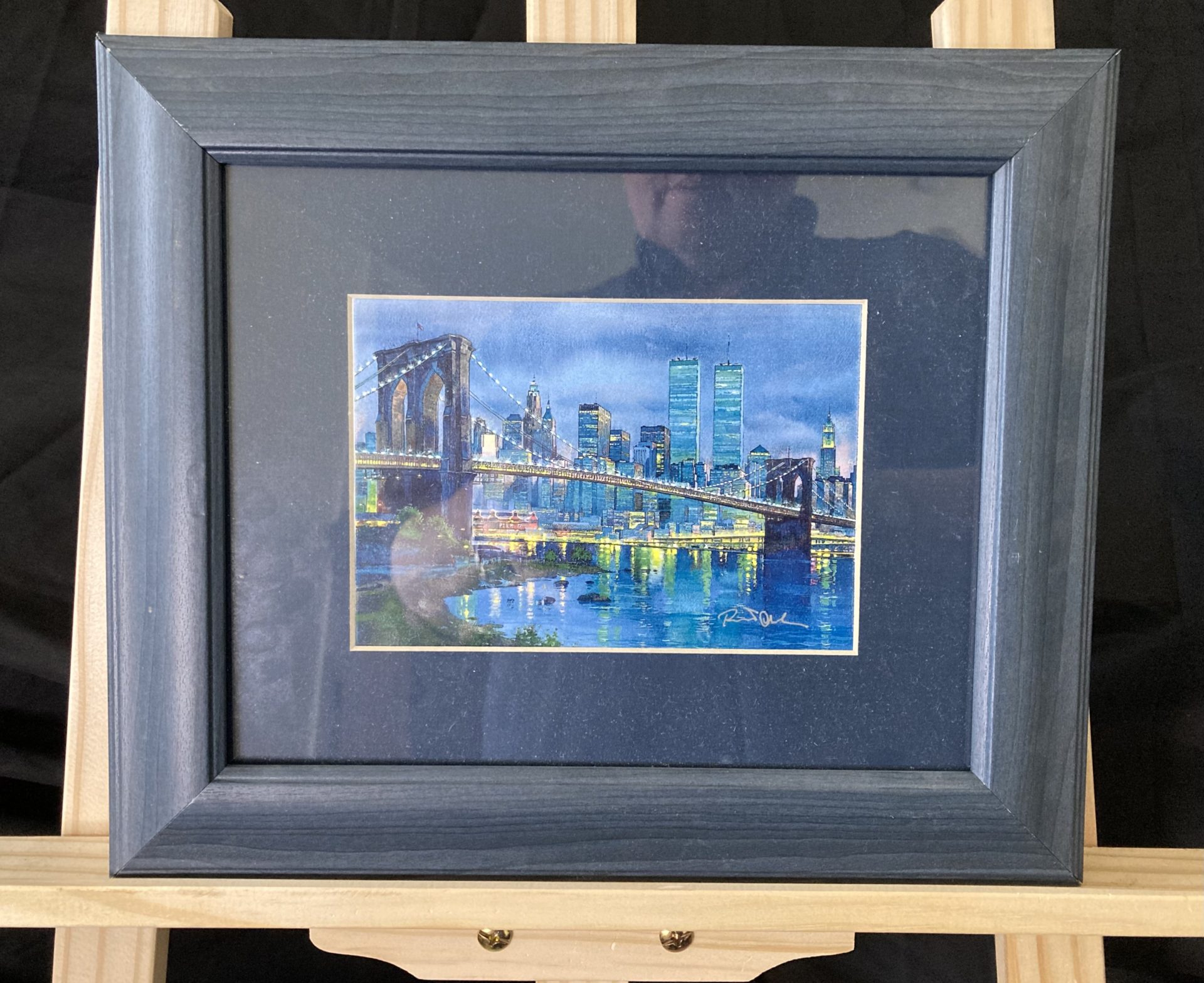 A beautifully colourful depiction of New York, specifically focusing on the Brooklyn Bridge looking towards Manhattan Island. Circa late-twentieth century given the inclusion of the iconic Word Trade Centre towers.