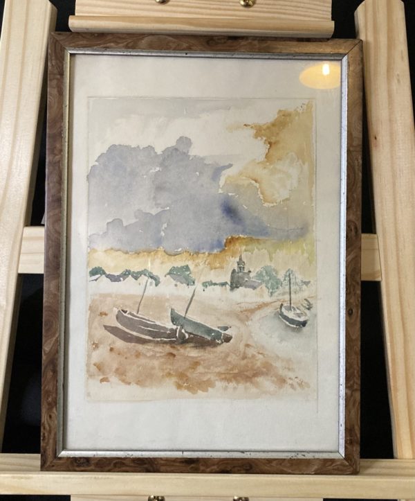 A wispy, dreamlike watercolour of fishing boats on a faraway shore.