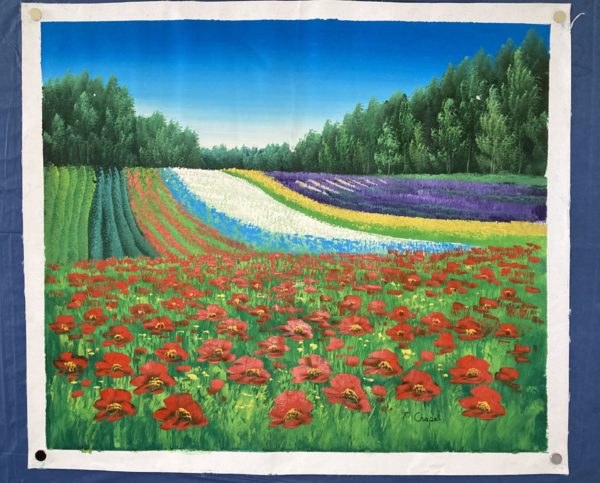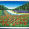 A bold and daring use of colour presented in a charming and vibrant way, this floral countryside scene offers uncompromising beauty for those unintimidated by its heartfelt passion. From the stunning red poppies in the immediate foreground to the soldier-like leylandii’s flanking the rear, undoubtedly this scene’s talking point is the rainbow-like lines of flora being grown within the field. Lively and engaging colours bring this scene to life in an almost magical way.