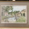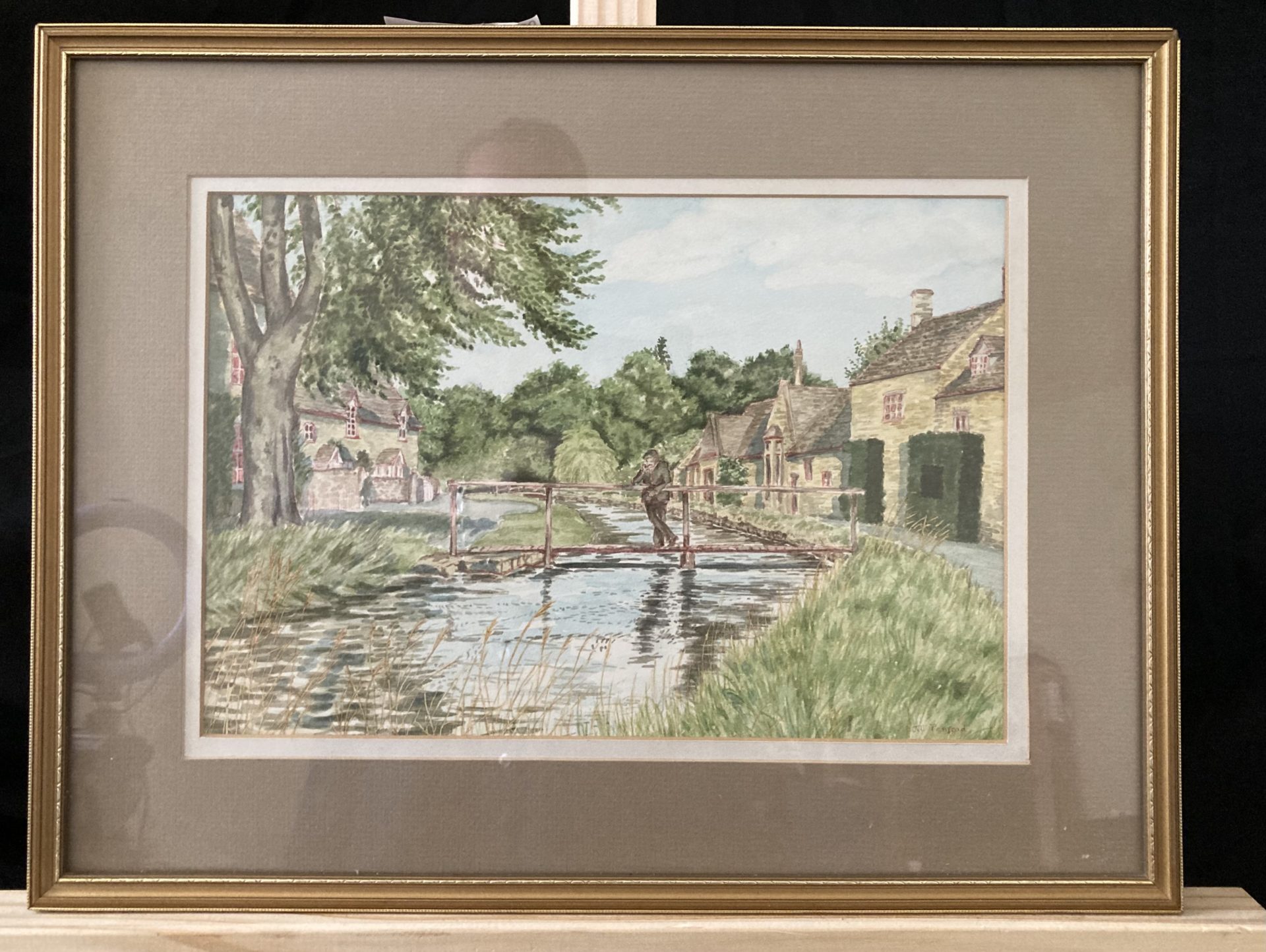 A detailed watercolour village scene featuring a man on a footbridge.
