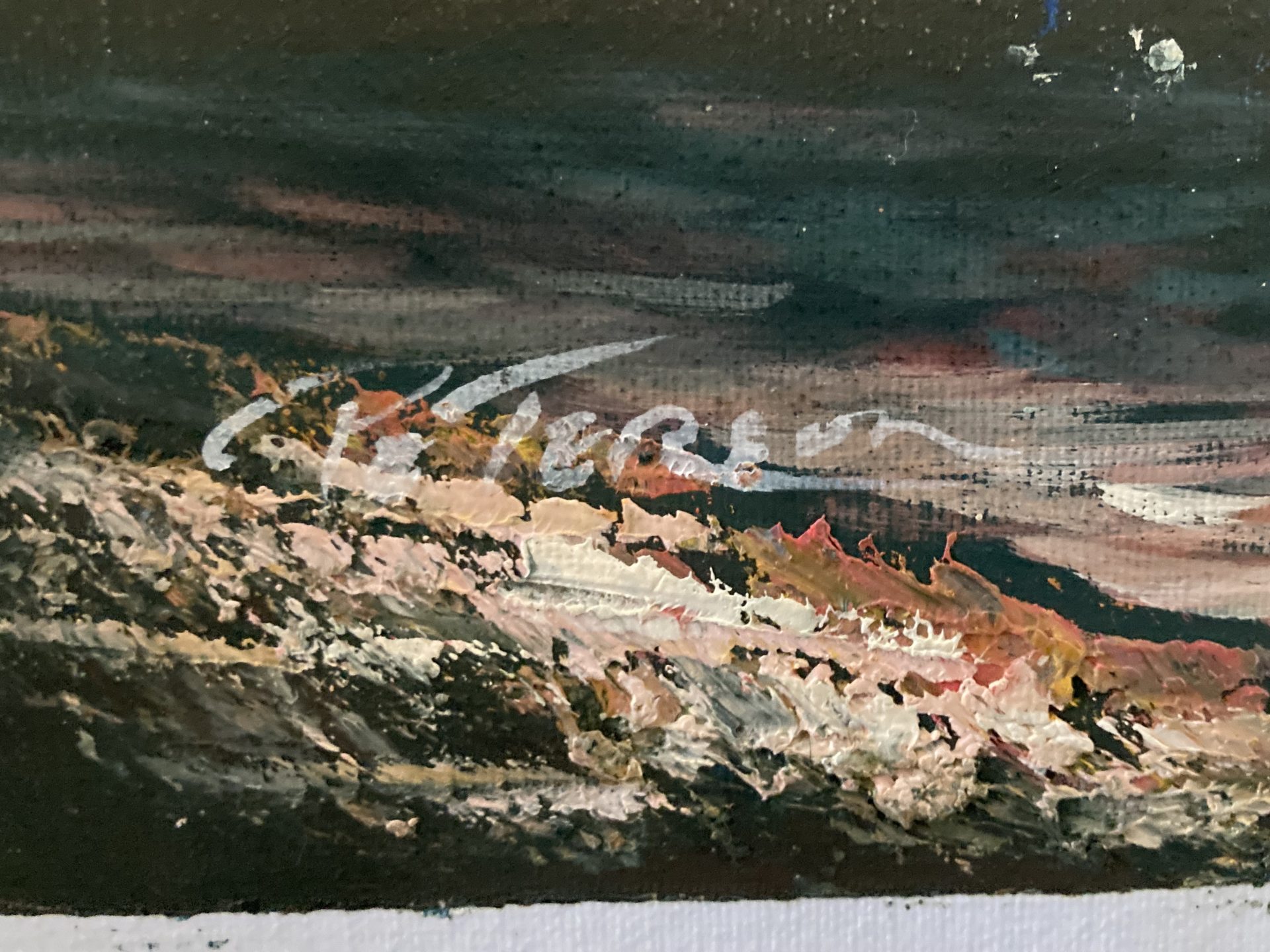 A vibrant tide laps the waiting shore. The combination of blues and whites offer a contemplative calm, whilst the darker tones of the sand and the rocks offer a reminder of that which remains fixed and ever-present. Great definition and detail in this evocative piece.