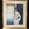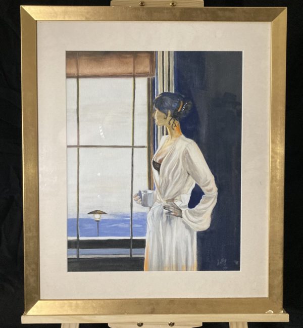 A formal composition of a beautiful woman thoughtfully gazing out of a window.