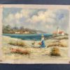 A serene and intimate coastal scene of a woman walking her beloved dog along a charming and secluded beach. One can almost feel the breeze running through the scrub along the shoreline as the lighthouse keeps watch in the distance and the small town peeks across the horizon of the bay.