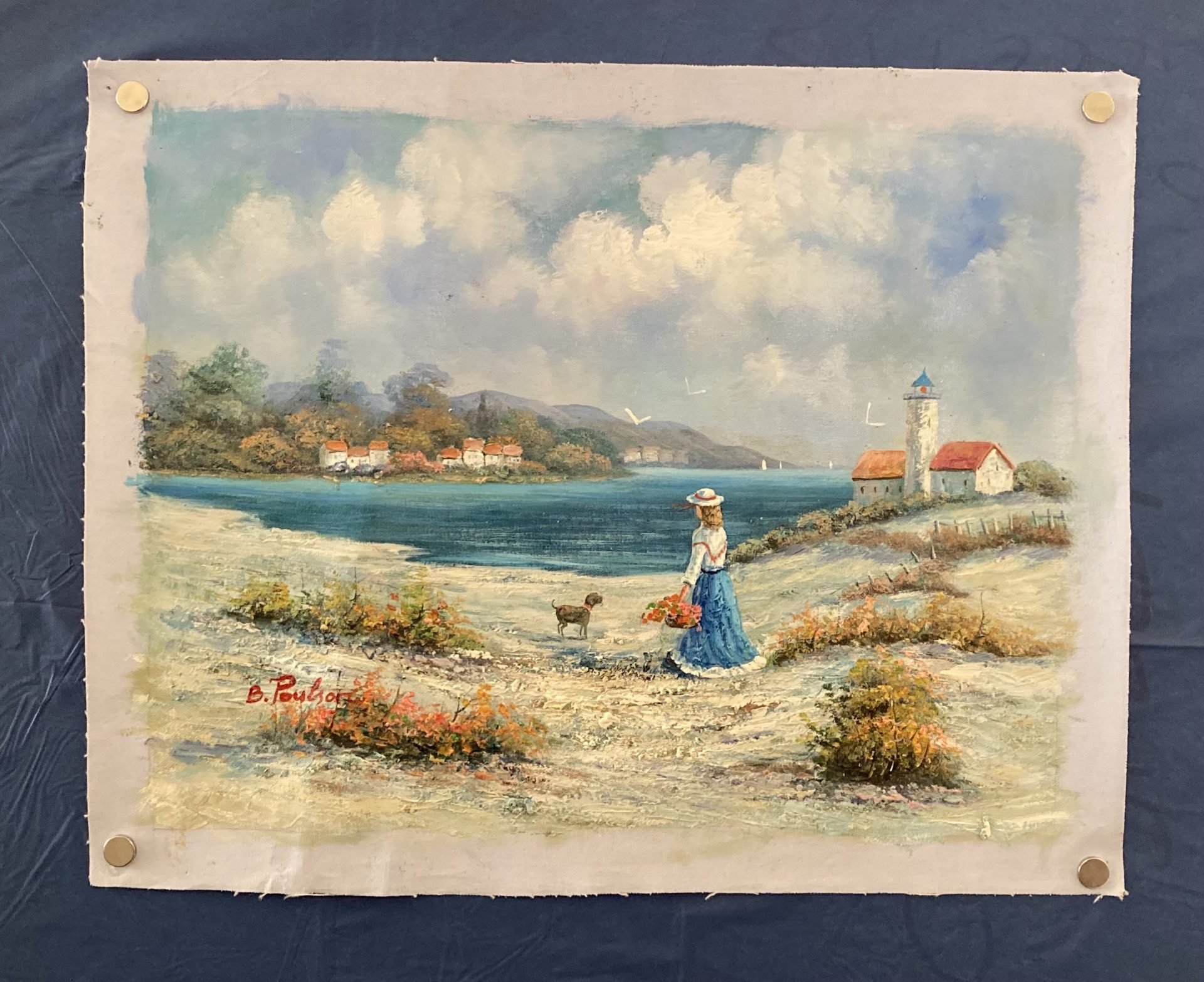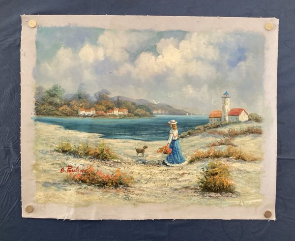 A medium Oil painting of a woman walking down by the coast with her dog with ships in the distance, A lovely range of colours used within this very vibrant piece.