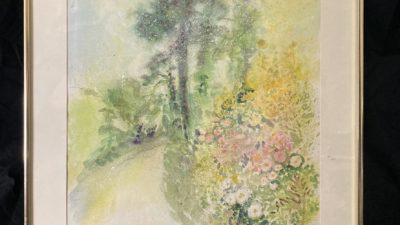 Summertime Park scene of trees and flowers – Oil on Board